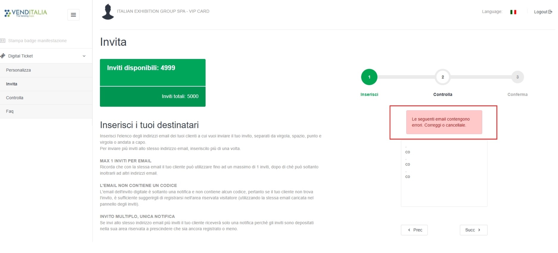 Gli invii che falliscono (dovuti a errori nell’indirizzo o server di destinazione) saranno nuovamente a tua disposizione. Alla stessa persona puoi mandare nuovamente l'invito. Il destinatario riceve un’unica e-mail di notifica e troverà gli inviti nella sua area riservata, tutti elencati come “Biglietto offerto da…” tua ragione sociale.