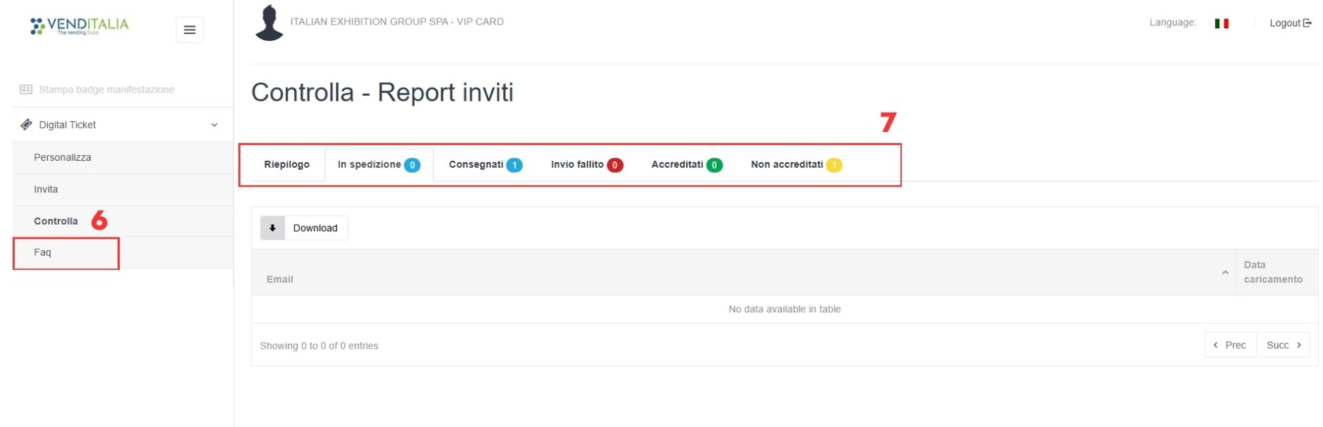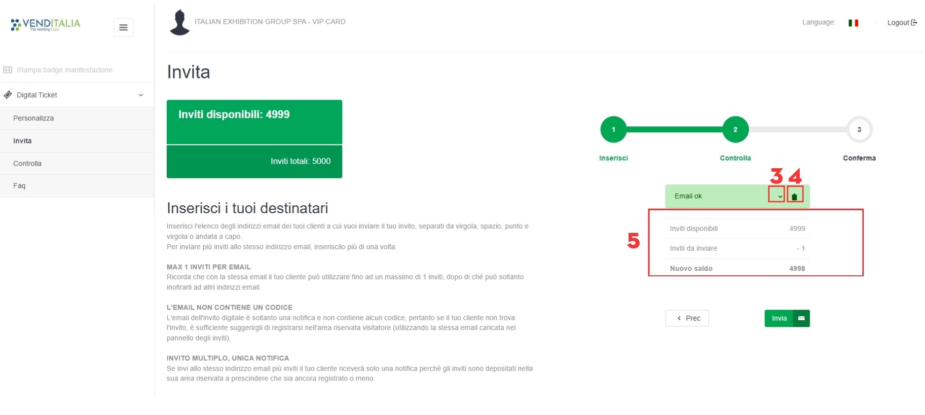 - Monitorare quanti inviti stai spedendo e quanti rimangono a tua disposizione (vedi 5 in figura):